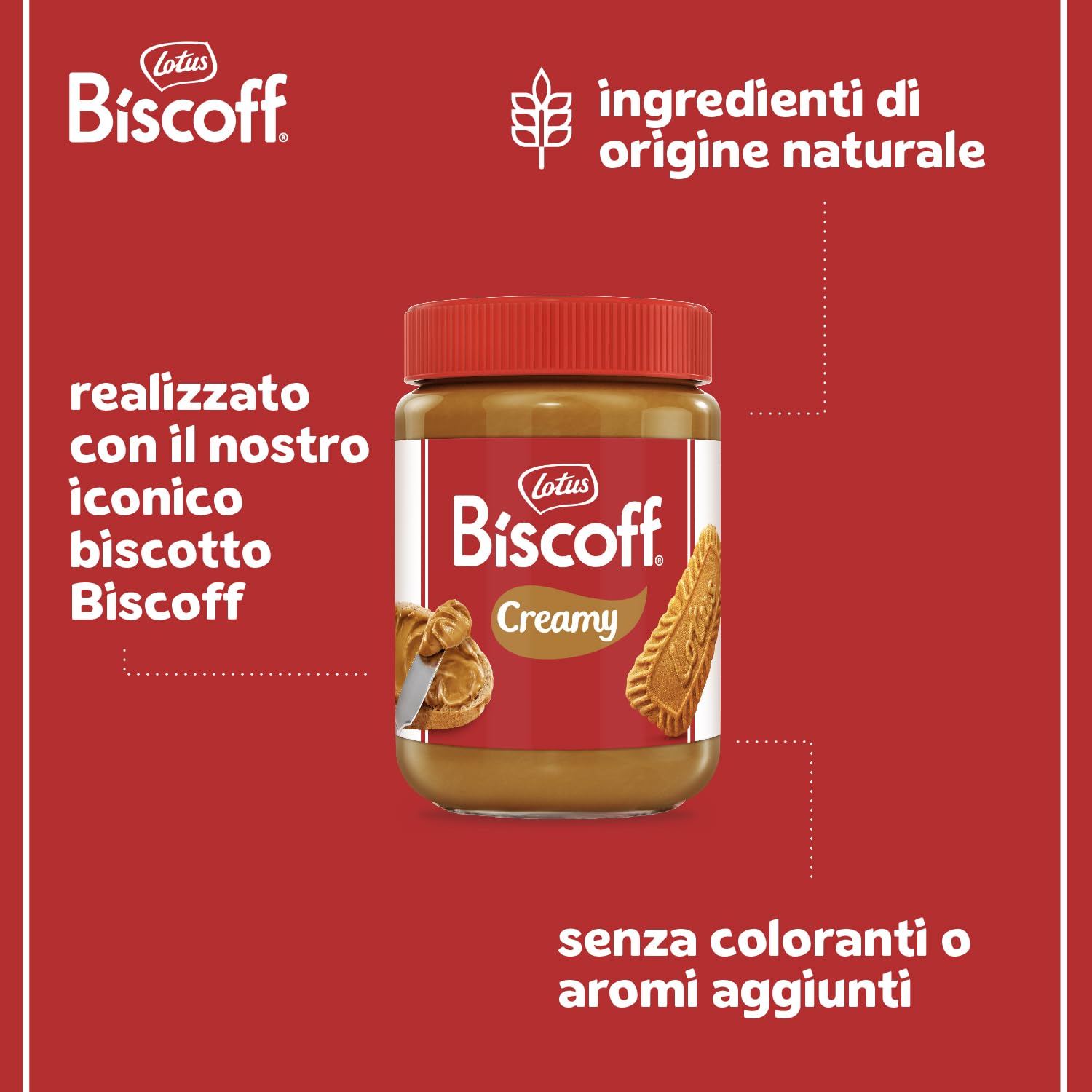 - INGREDIENTI DI ORIGINE NATURALE - La nostra crema spalmabile Biscoff non contiene coloranti, aromi o conservanti artificiali - Olio di palma non OGM, certificato RSPO. Vegana. Non contiene frutta a guscio. Prodotto in Belgio in uno stabilimento che non tratta frutta a guscio.