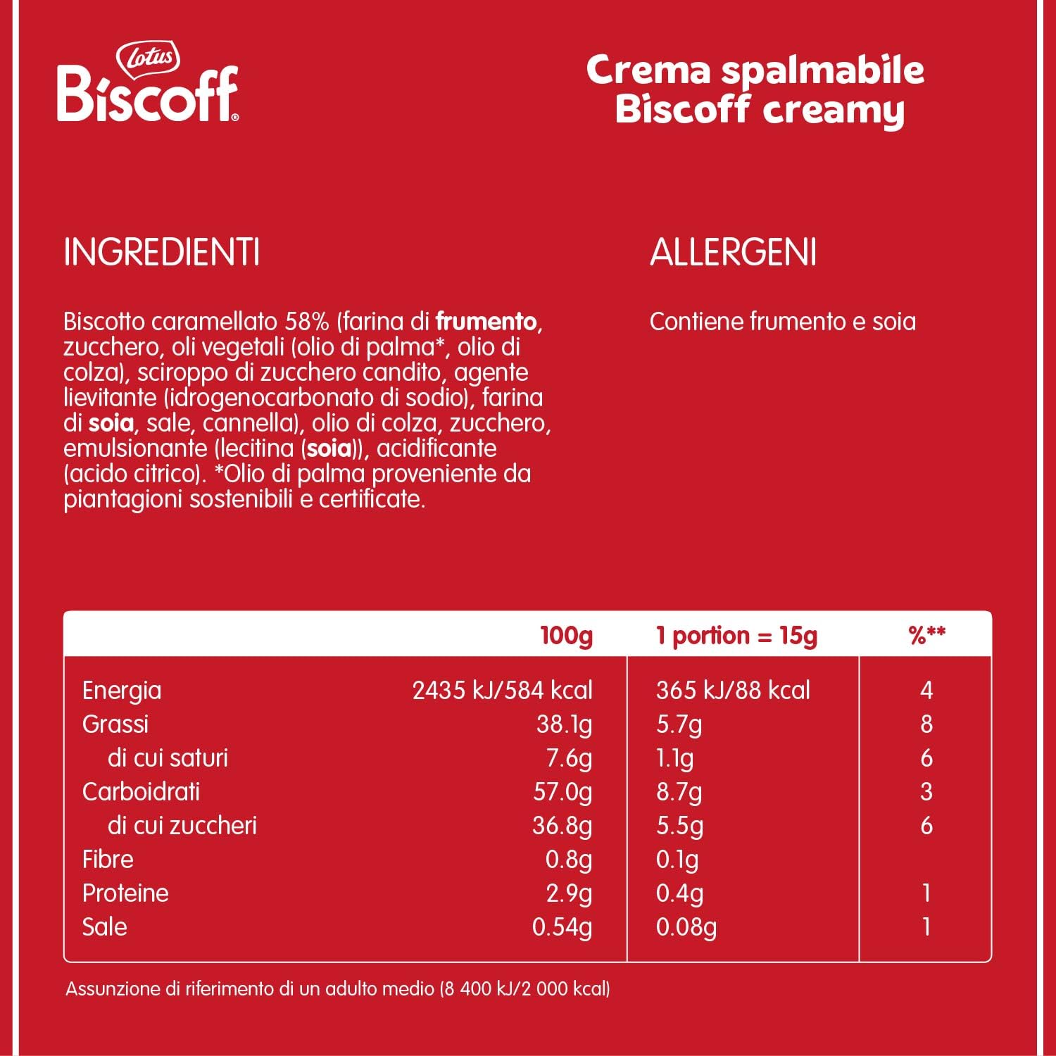 DE: BROTAUFSTRICH AUS KARAMELLGEBÄCK - Zutaten: Karamellgebäck 58% (WEIZENmehl, Zucker, pflanzliche Öle (Palm*, Raps), Kandiszuckersirup braun, Backtriebmittel (Natriumhydrogencarbonat), SOJAmehl, Salz, Zimt), Rapsöl, Zucker, Emulgator (Lecithine (enthält SOJA)), Säuerungsmittel (Citronensäure). *Zertifiziertes Palmöl aus nachhaltigem Anbau. IT: CREMA SPALMABILE DI BISCOTTI CARAMELLATI - Ingredienti: Biscotto caramellato 58% (farina di FRUMENTO, zucchero, oli vegetali (olio di palma*, olio di colza), sciroppo di zucchero candito, agente lievitante (idrogenocarbonato di sodio), farina di SOIA, sale, cannella), olio di colza, zucchero, emulsionante (lecitine (SOIA)), acidificante (acido citrico). *Olio di palma proveniente da piantagioni sostenibili e certificate. ES: CREMA PARA UNTAR DE ORIGINAL GALLETA CARAMELIZADA - Ingredientes: Galletas caramelizadas 58% (harina de TRIGO, azúcar, aceites vegetales (aceite de palma*, aceite de nabina), jarabe de azúcar moreno, gasificante (bicarbonato sódico), harina de SOJA, sal, canela), aceite de nabina, azúcar, emulgente (lecitinas (SOJA)), ácido (ácido cítrico). *Aceite de palma proveniente de plantaciones sostenibles y certificadas. FR: PÂTE À TARTINER À BASE DE BISCUITS CARAMÉLISÉS - Ingrédients: Biscuits caramélisés 58% (farine de BLÉ, sucre, huiles végétales (palme*, colza), sirop de sucre candi, poudre à lever (carbonate acide de sodium), farine de SOJA, sel, cannelle), huile de colza, sucre, émulsifiant (lécithines (SOJA)), acidifiant (acide citrique). *Huile de palme issue de plantations durables et certifiées.