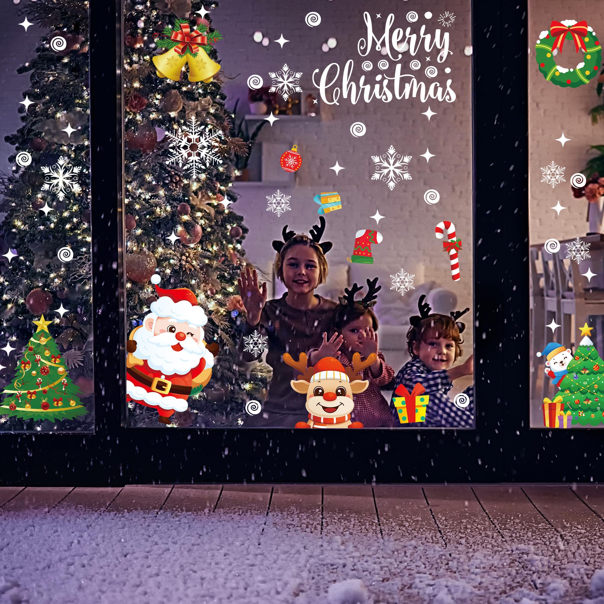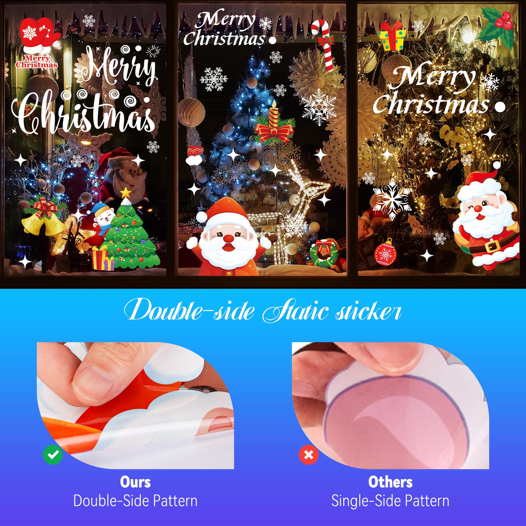 • 🎄【Decorazioni Natalizie】È possibile attaccare questo vetrofanie natale a qualsiasi superficie liscia e piana come una finestra, una porta, un frigorifero, uno specchio e altro ancora. Potete applicare le vetrofanie natalizie in molte occasioni: feste di Natale a casa, nei supermercati o nei negozi, decorazioni natalizie nelle scuole, finestre nelle camere dei bambini. Porterà una forte atmosfera di festa alla vostra festa!