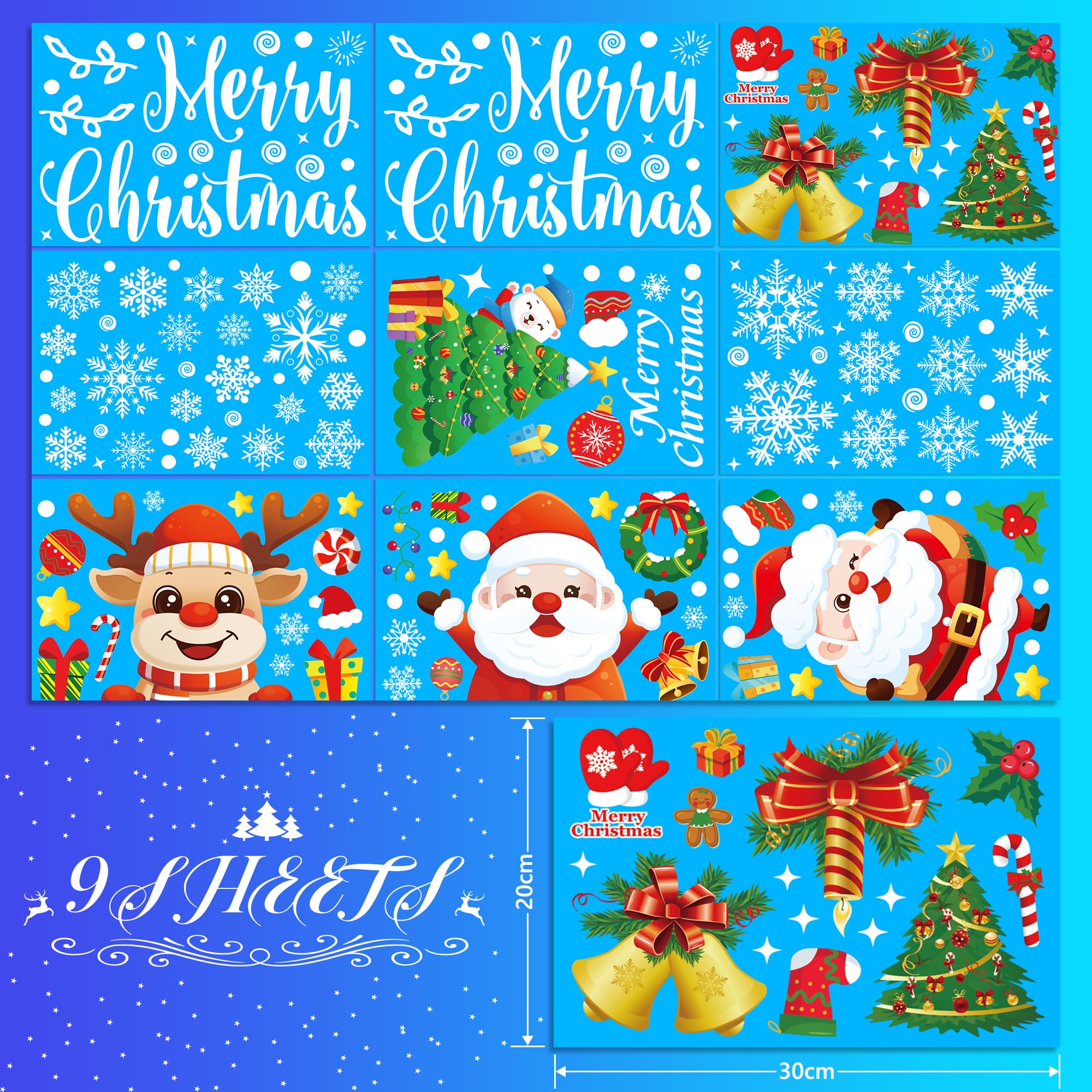 • 🎅【Adesivi Natalizi per Finestre】Riceverete 162 pezzi di adesivi natalizi per finestre in 9 fogli con ricchi elementi natalizi classici, come fiocchi di neve, stella, pacco regalo, pupazzo di neve, Babbo Natale, albero di Natale, alce, Bauble e altri modelli, aggiungere più atmosfera alla vostra festa di Natale. Perfetto per decorare le finestre delle feste di Natale.