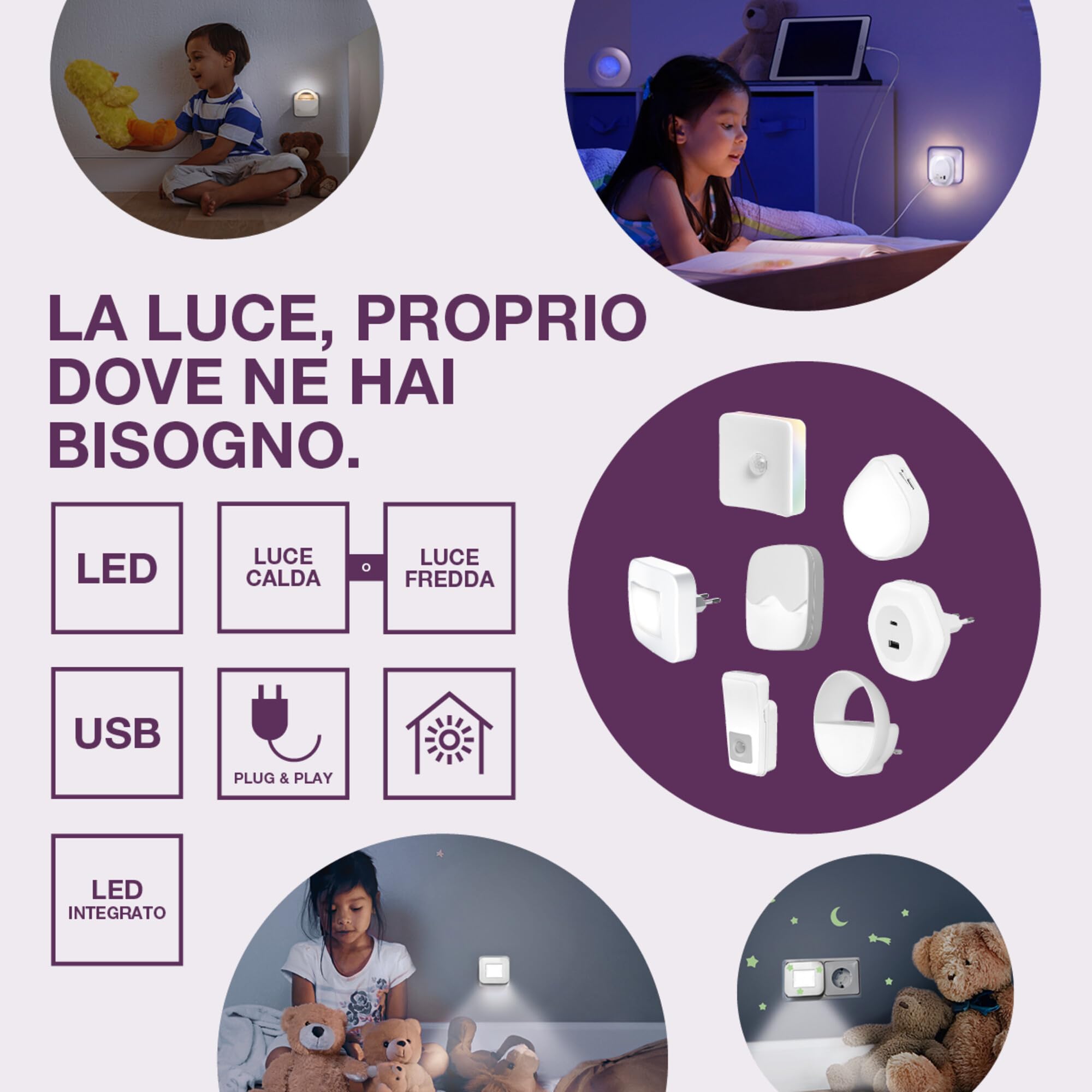 - Emissione luminosa: luce bianca calda con temperatura colore 3000 K e flusso luminoso 3 lm; offre un'illuminazione discreta e piacevole per le camere da letto e le camerette dei bambini