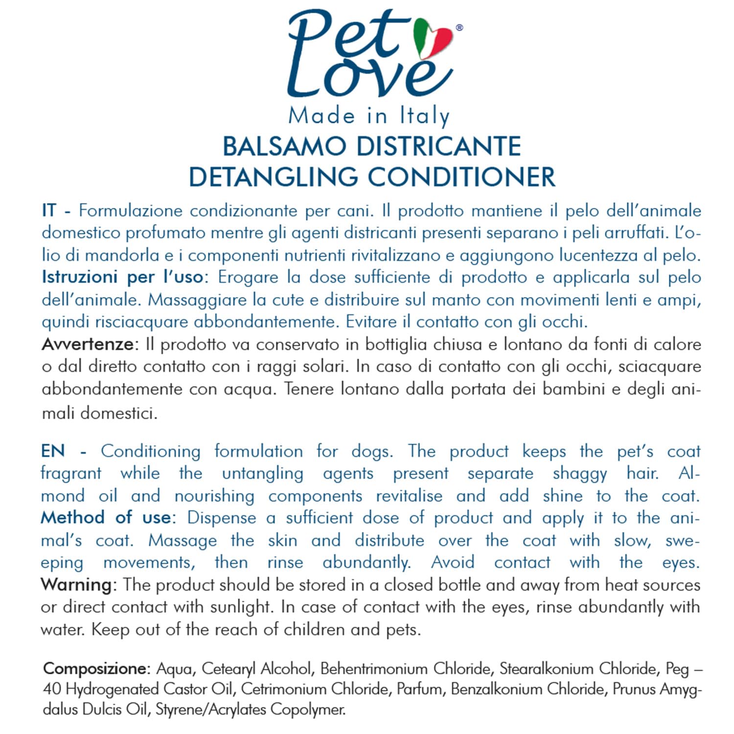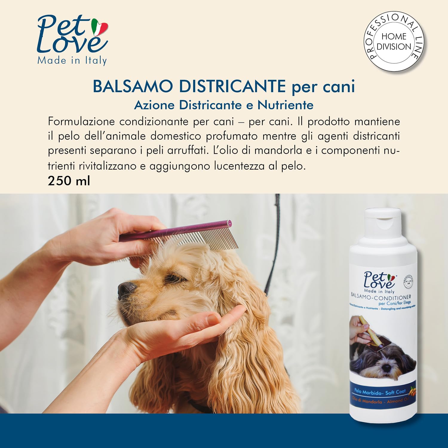 • BALSAMO PER CANI – Formulazione condizionante per cani. Il prodotto mantiene il pelo dell’animale domestico profumato mentre gli agenti districanti presenti separano i peli arruffati. L’olio di mandorla e i componenti nutrienti rivitalizzano e aggiungono lucentezza al pelo.