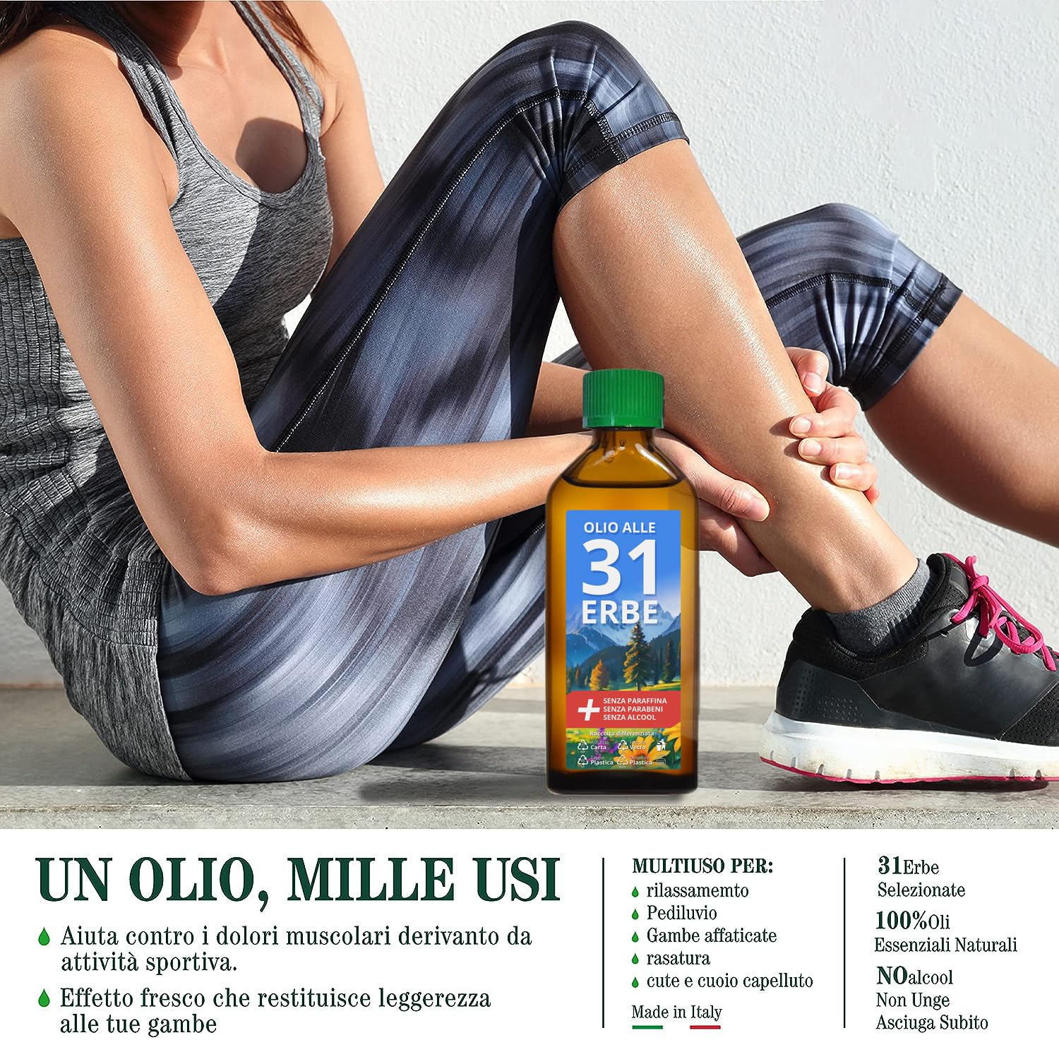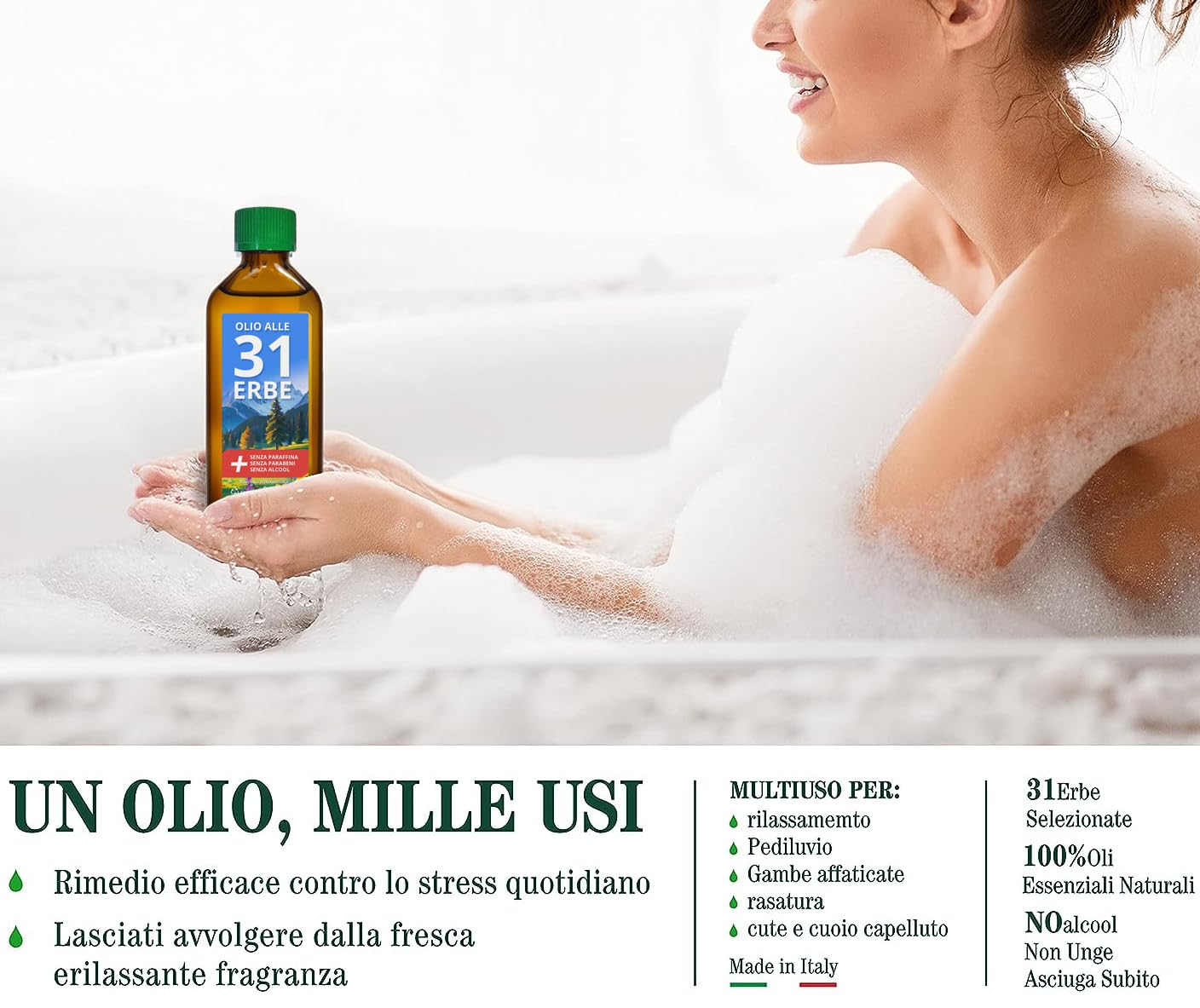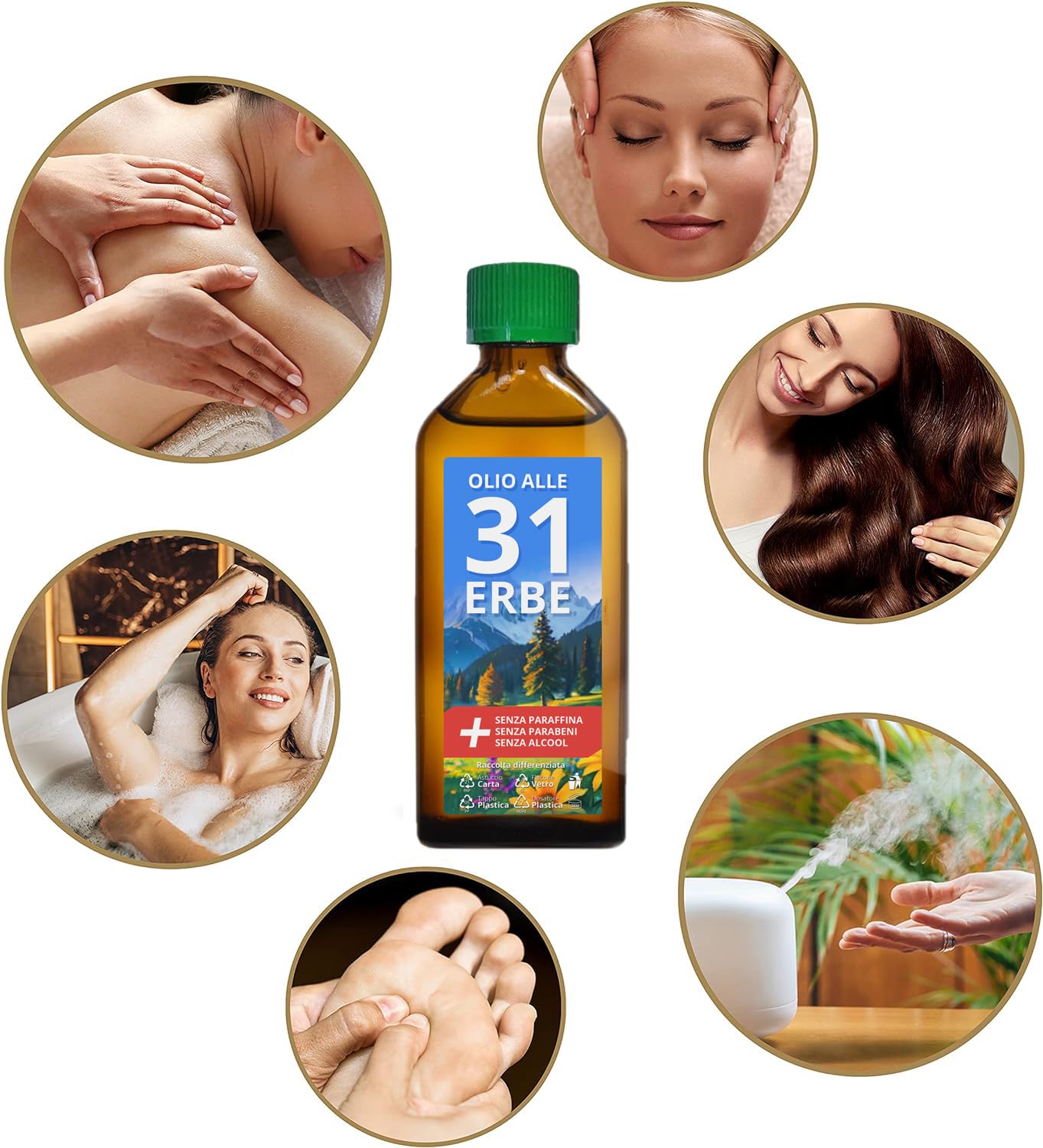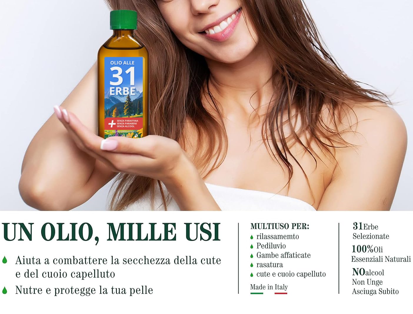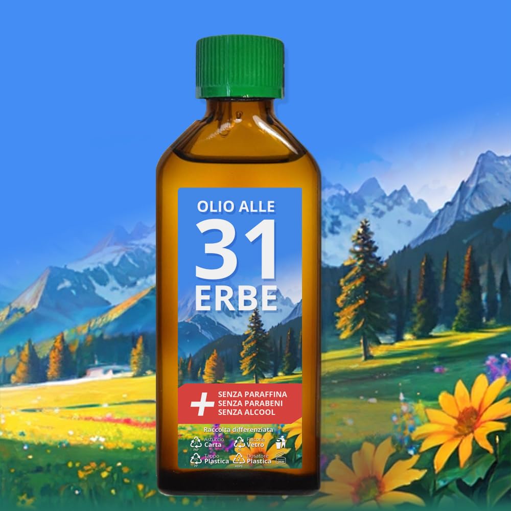 - L'OLIO ALLE 31 ERBE E' DA TENERE A PORTATA DI MANO IN CASO DI: Raffreddore Mal di testa Mal di schiena Cervicale Crampi addominali Stress Stanchezza Forfora Rughe UTILE ANCHE COME: Dopobarba. Profumatore per ambienti, armadi o cassetti. Purificatore per ambienti.