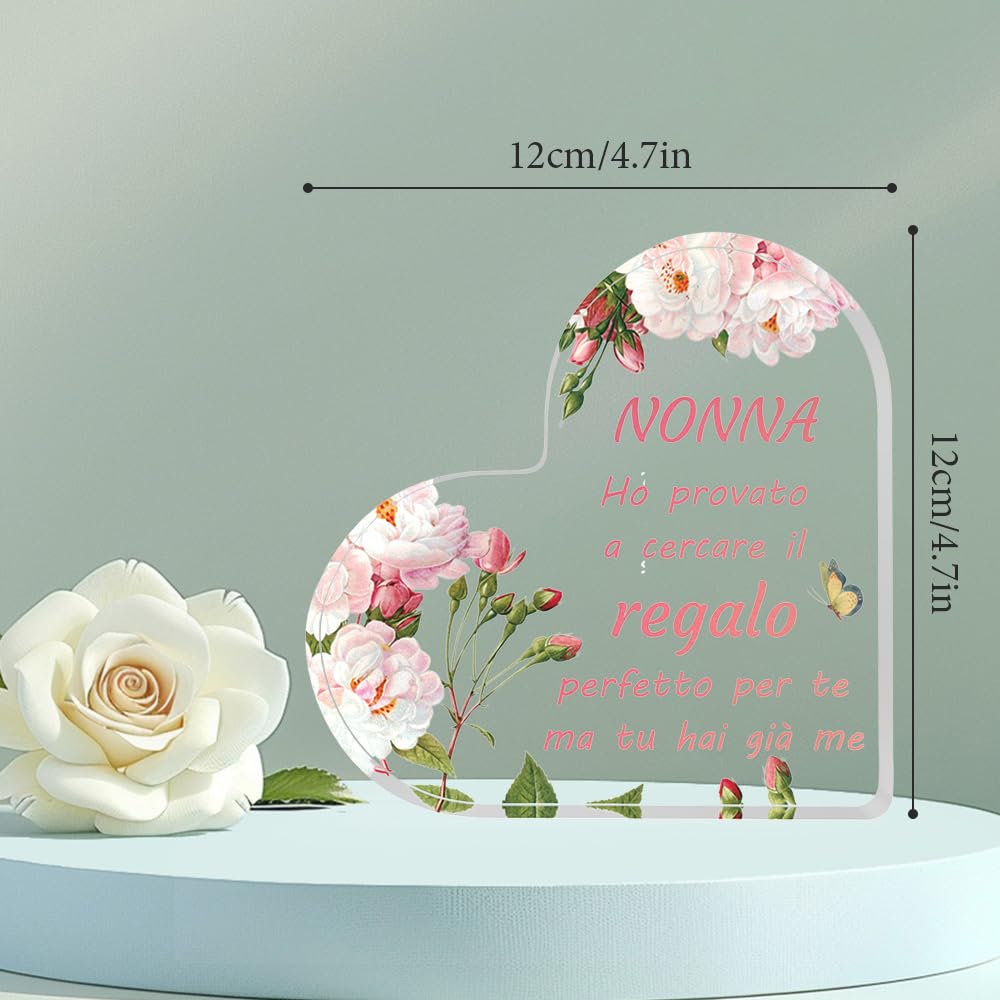 • DIMENSIONE DEL PRODOTTO: La targhetta regalo in acrilico a forma di cuore misura 12x12 cm ed è spessa 1,5 cm. È perfetta come regalo per la nonna da parte del nipote o della nipote e costituisce un'ottima decorazione ovunque.