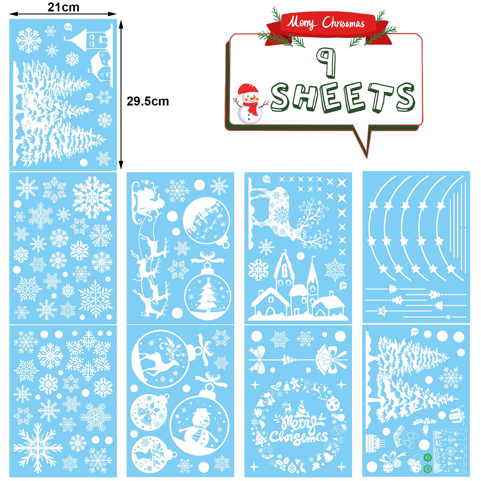 - Bellissimi adesivi natalizi: 9 fogli adesivi natalizi per vetrine. Ogni foglio di murales di Natale è: 21x29,5 cm Le dimensioni perfette sono ideali per le decorazioni delle finestre di Natale. Motivi classici come fiocco di neve, alce, albero di Natale, motivo totale di 163 elementi, ecc.