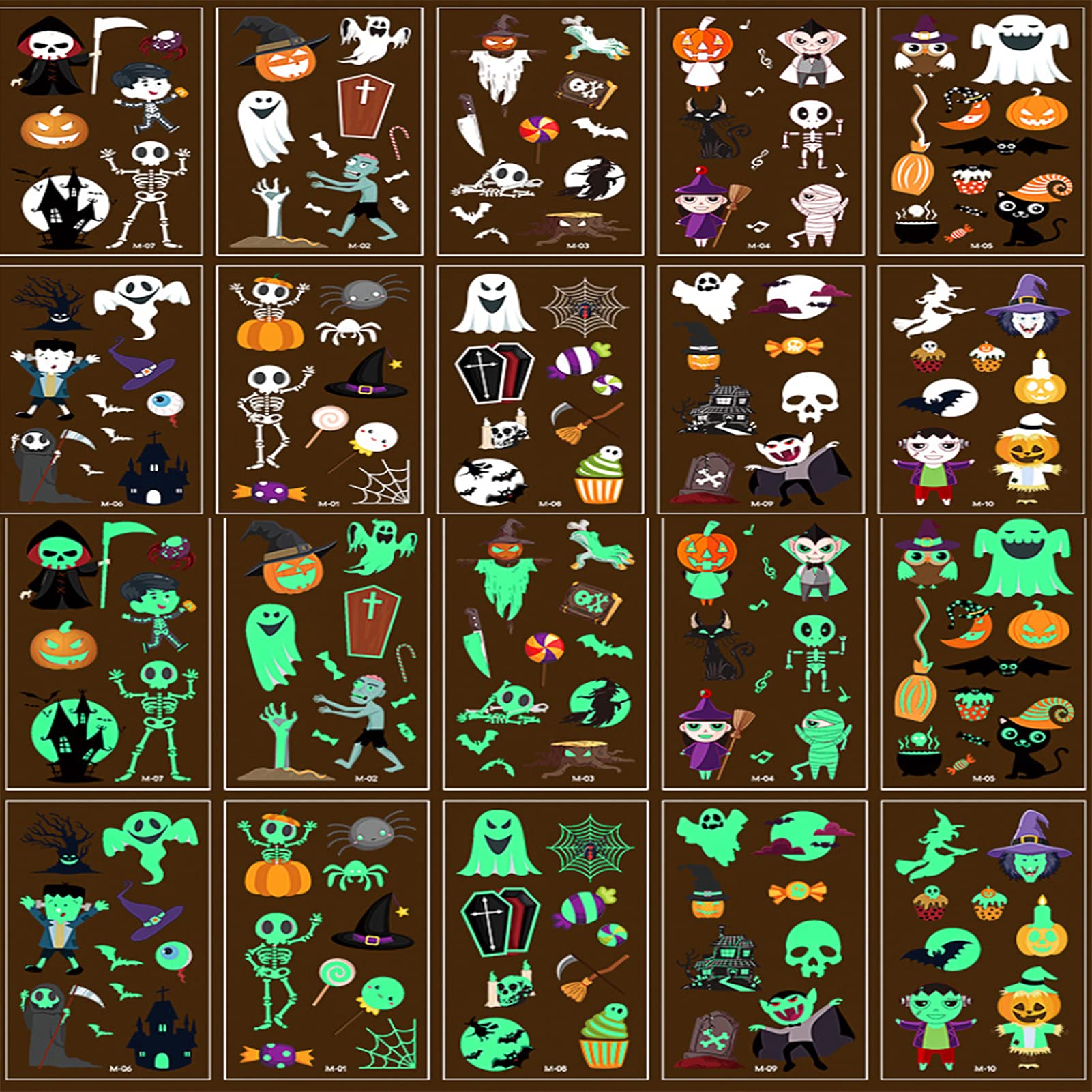 - 【Glow in the dark】10 adesivi per tatuaggi, diverse combinazioni, tatuaggi temporanei fluorescenti possono migliorare l'atmosfera di Halloween e spaventare i tuoi amici al buio.
