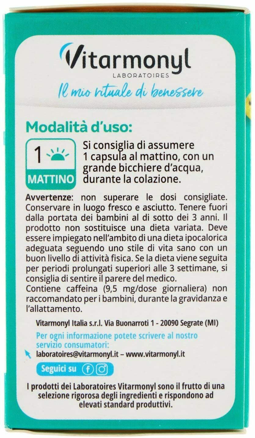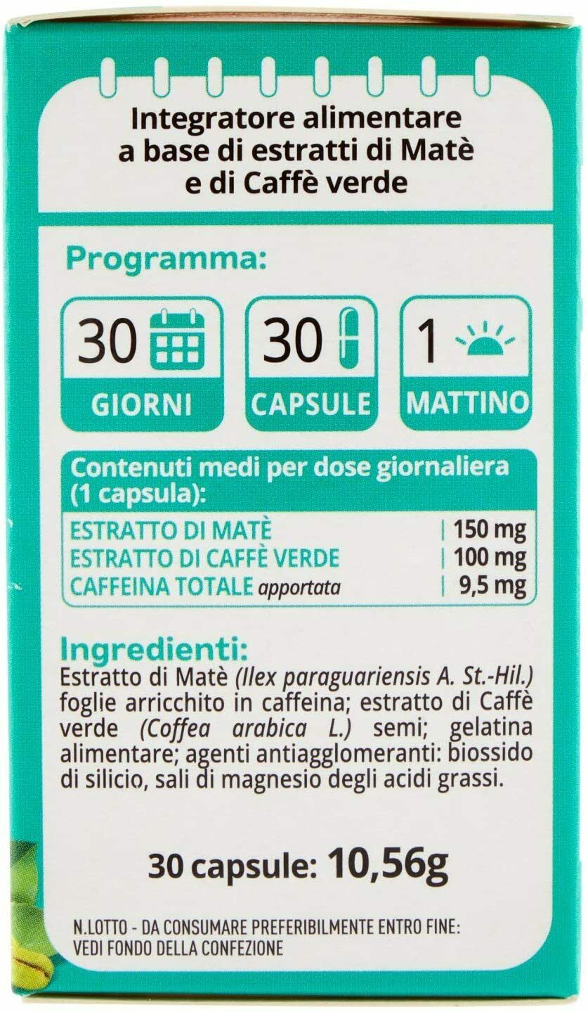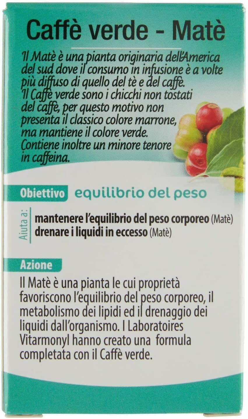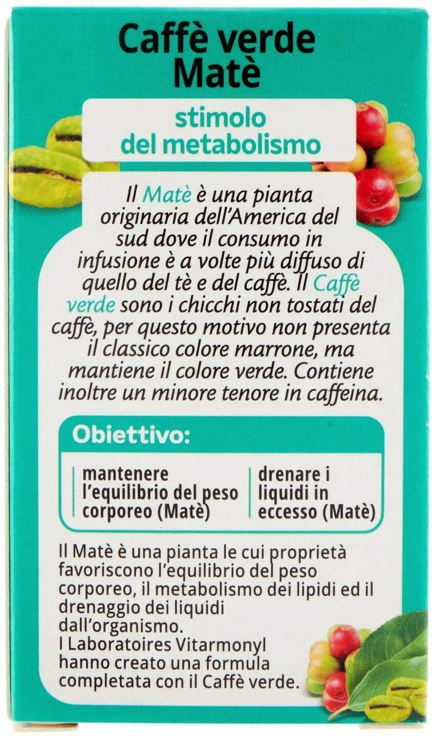 Descrizione prodotto: Caffe verde sono i chicchi non tostati del caffè, per questo motivo non presenta il classico colore marrone, ma mantiene il colore verde; contiene un minore tenore in caffeina Mate è una pianta le cui proprietà favoriscono l'equilibrio del peso corporeo, il metabolismo dei lipidi e il drenaggio dei liquidi dell'organismo Assunzione si consiglia di assumere una capsula al mattino con un grande bicchiere d'acqua, durante la colazione Il caffè verde è formato dai chicchi non tostati del caffè, per questo motivo non presenta il classico colore marrone, ma mantiene il suo colore originale. Contiene inoltre un minore tenore in caffeina. Il matè è una pianta le cui proprietà favoriscono l'equilibrio del peso corporeo, il metabolismo dei lipidi ed il drenaggio dei liquidi dall'organismo. I laboratoires vitarmonyl hanno creato una formula completata con il caffè verde. Modalità d'uso: si consiglia di assumere una capsula al mattino con un grande bicchiere d'acqua, durante la colazione.