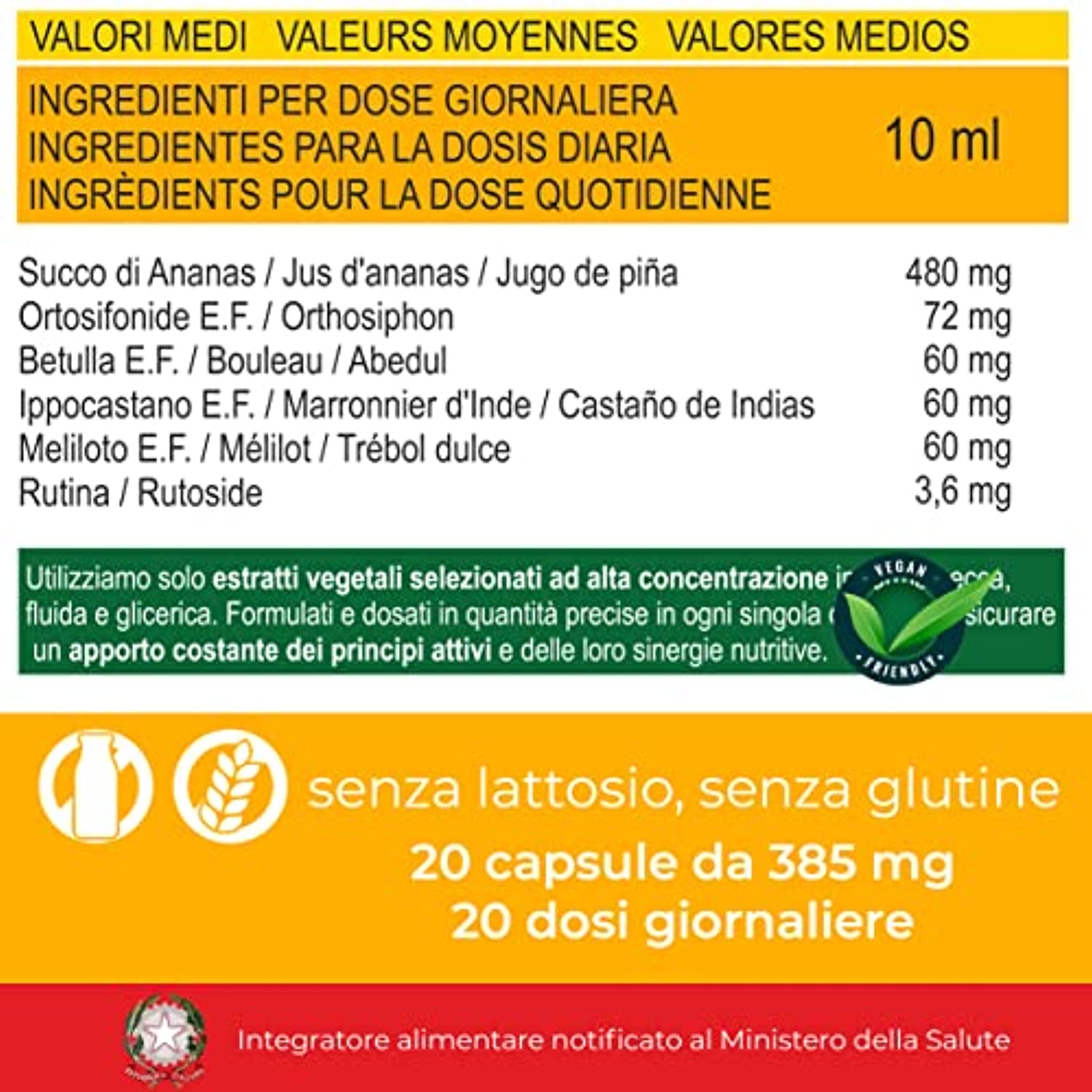 Con estratti secchi di: Betulla titolato in iperoside, Meliloto titolato in cumarina, Rutina, Ananas titolato in bromelina, Ippocastano titolato in escina, Ortosiphon titolato sinestetina