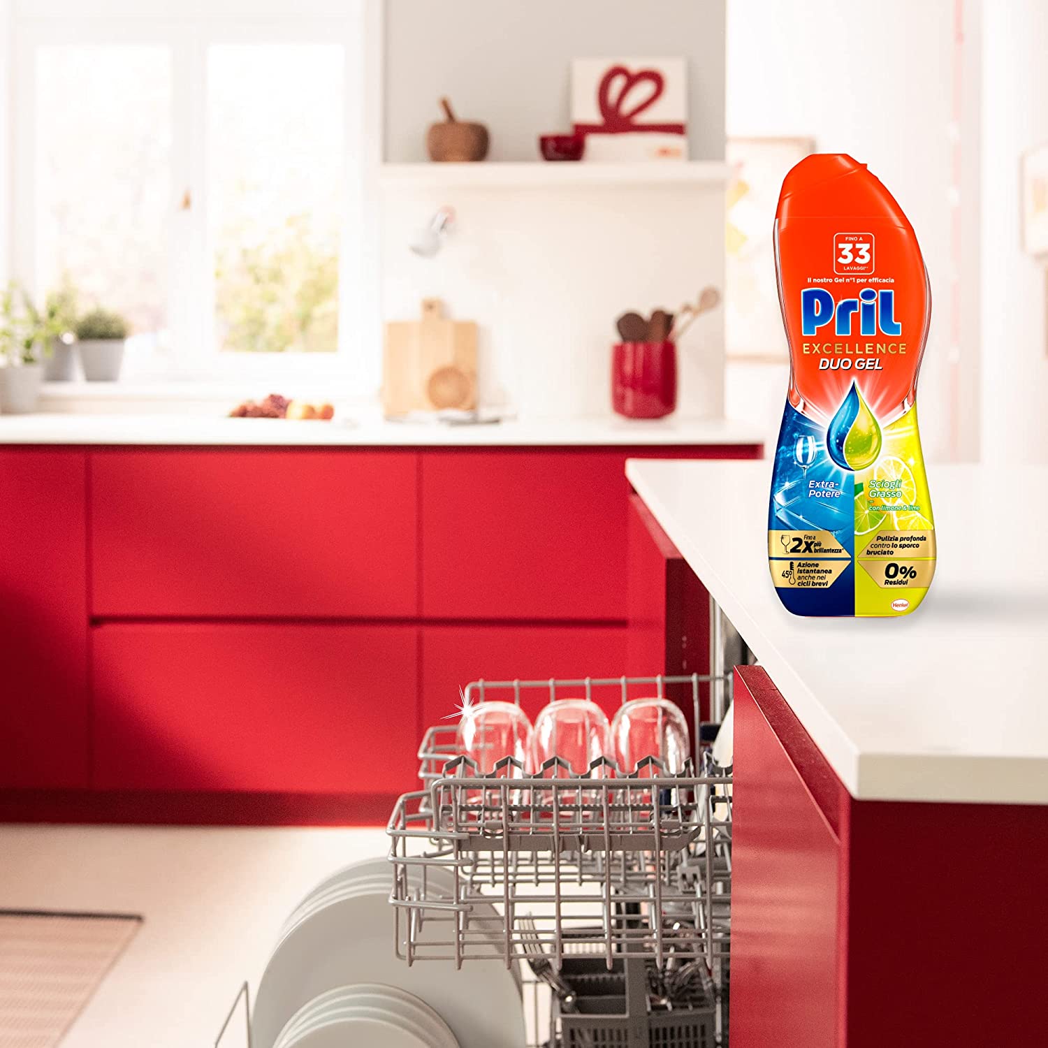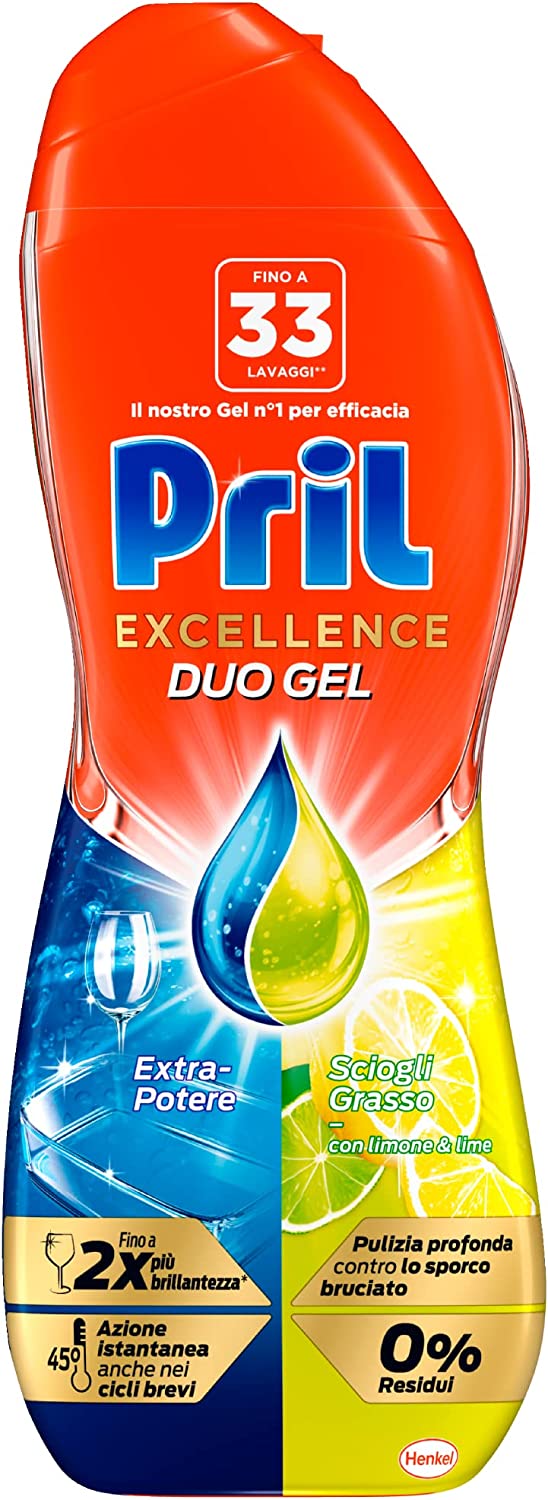 Contenuto confezione: Pril Excellence Duo Gel Sciogli Grasso, detersivo lavastoviglie gel con sgrassatore attivo, elimina lo sporco ostinato