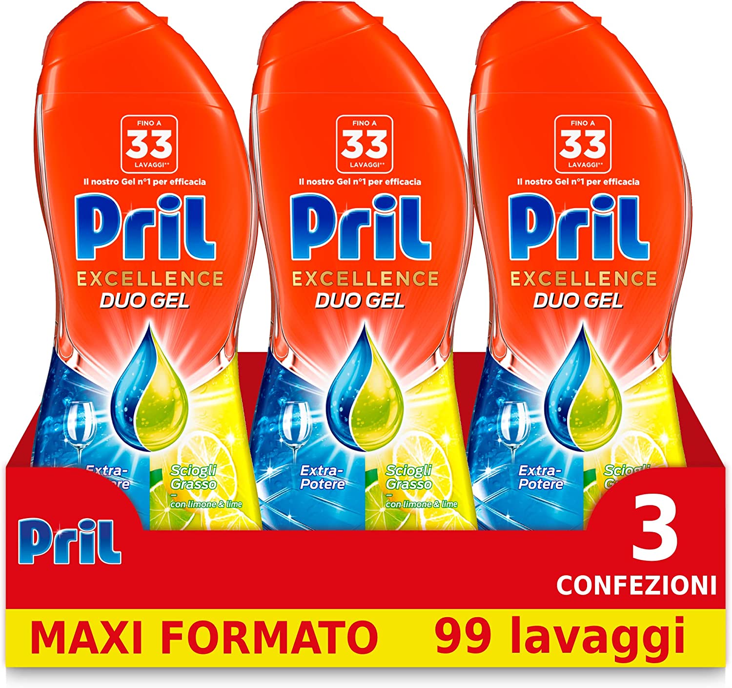 Pril Excellence Duo Gel, Detersivo in Gel, azione sciogligrasso, con limone, Formato da 3 Confezioni da 33 Lavaggi