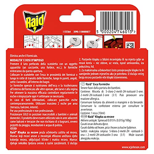 Dettagli: Descrizione Descrizione Raid Esca Formiche è un'esca pronta all'uso per il controllo delle formiche. Contiene un supporto impregnato che attrae le formiche, che a loro volta trasporteranno la sostanza attiva all'interno del nido. È indicata per la disinfestazione di case d'abitazione, luoghi di ritrovo e industrie di ogni genere. Usare i biocidi con cautela. Prima dell’uso leggere sempre l’etichetta e le informazioni sul prodotto. Ingredienti Spinosad (Cas n. 168316-95-8) 0,0166% p/p Composizione: Contenuto della confezione 1 pezzo Raid Esca Formiche Visualizza di più Ingredienti Spinosad (Cas n. 168316-95-8) 0,0166% p/p Composizione: Contenuto della confezione 1 pezzo Raid Esca Formiche