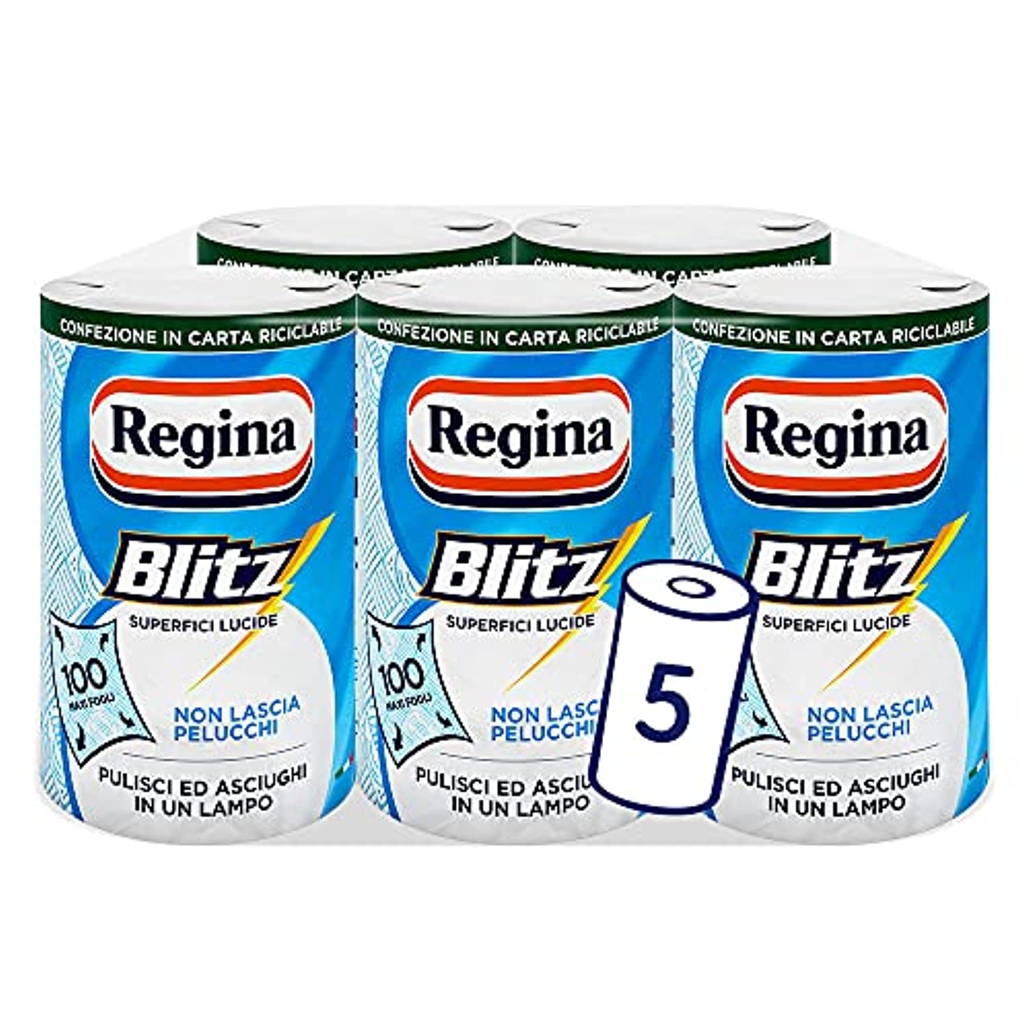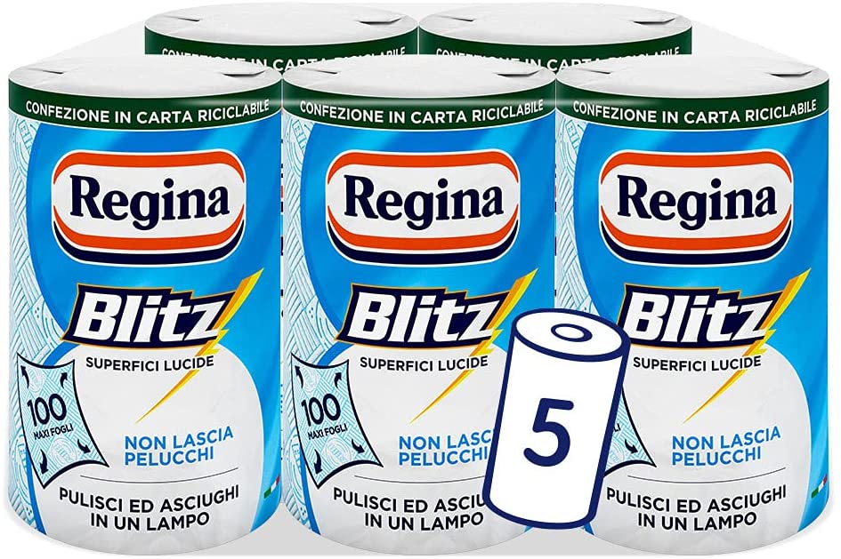 Regina Blitz è ancora più amica dell'ambiente grazie alla confezione in carta riciclabile che contiene 5 rotoli di carta asciugatutto a 3 veli, 100 strappi per ogni rotolo (*tolleranza 5%)