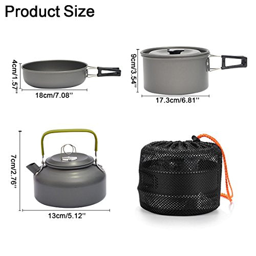 - Set da cucina all'aperto a tutto tondo: padella antiaderente per friggere il cibo; Pentola ad alta capacità con coperchio per cibo o zuppa (pentola / padella hanno manici lunghi e resistenti al calore da ripiegare per cucinare); Teiera portatile 0.8L per caffè o acqua bollente; Cucchiaio e ciotole riutilizzabili, apri del vino, spatola di legno e kit di pulizia per offrire un perfetto breakfirst / pranzo / cena per il tuo viaggio.