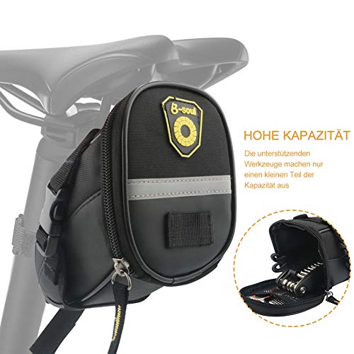 - Borsa da sella ben elaborata: La borsa resistente e funzionale è ben elaborata e può essere facilmente fissata alla sella e al reggisella. Il montaggio è semplice e veloce grazie alle cinghie a clip e alla chiusura in velcro. Una striscia riflettente garantisce una migliore visibilità al buio.