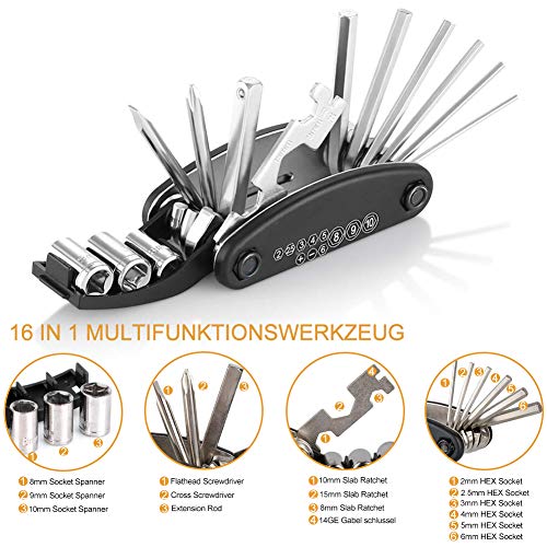- PRATICO: Il kit di attrezzi viene fornito con tutto il necessario per una riparazione a breve termine sulla bici. Soprattutto per mountain bike o bici da trekking che a volte vengono spostate fuoristrada. Dovrebbe essere sufficiente per un'emergenza.