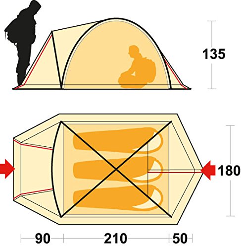Tenda alta e spaziosa con molte tasche ed un'ampia abside frontale. Tetto in doppio tessuto poliestere Diamond alluminato termoisolante. Interno in poliestere Diamond idrorepellente e traspirante con pavimento in Poliestere Oxford. Cuciture nastrate nel doppio tetto e nel pavimento. Struttura a tre pali in vetroresina precollegati con il palo veranda preformato che consente abitabilità superiore. Arco veranda con riferimento colore differenziato per facilitare il montaggio con picchetti in acciaio. Tenda interna sospesa alla paleria con ganci per montaggio rapido e guaine nel colmo. Porte con zanzariera esterna completamente apribili e riponibili in apposito taschino.