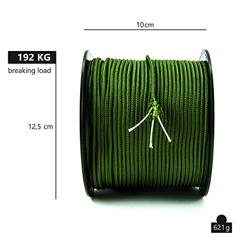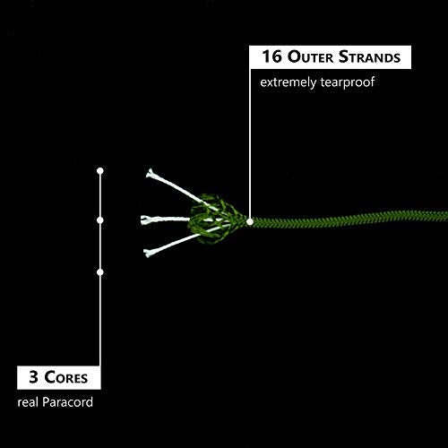 • FORTEMENTE & ANTISTRAPPO - Cordino da 3 mm resistente allo strappo con guaina esterna e tre robusti nuclei in multifilamento in 100% nylon. Il carico di rottura di questa vera corda Paracord (Tipo II) è di 192 chilogrammi e soddisfa quindi i più alti requisiti possibili.