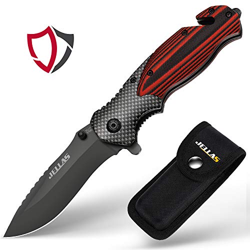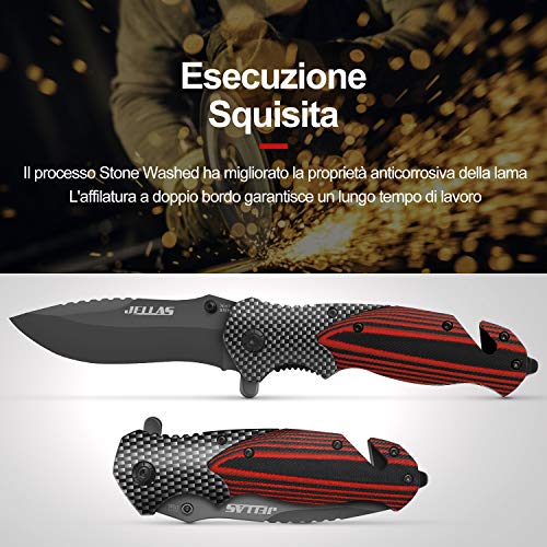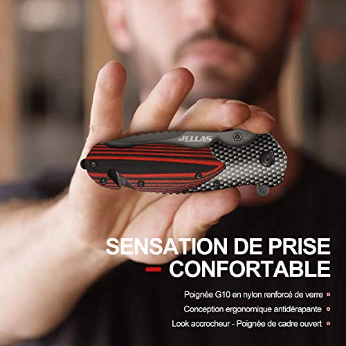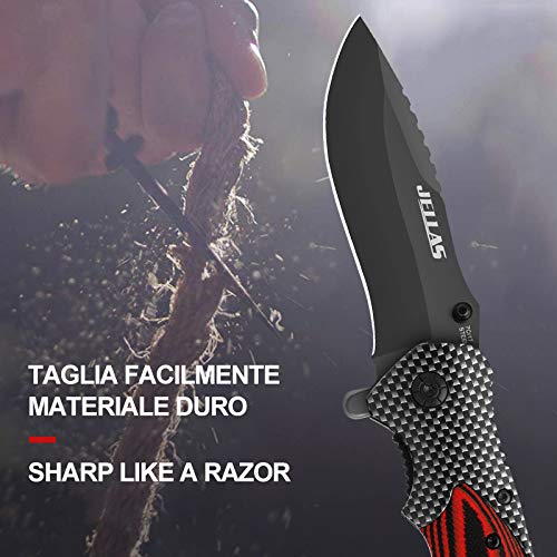 Jellas Coltello Pieghevole, 7Cr17 Coltello Soccorso Portatile di Sopravvivenza per Caccia, Campeggio attività all'Aperto Multiuso, Lama in Acciaio Inossidabile e Maniglia in Alluminio + G10