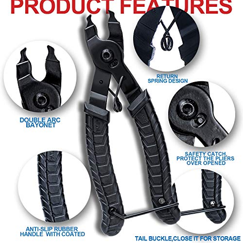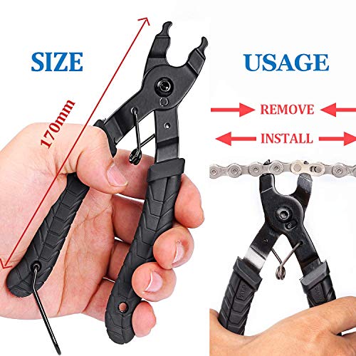 - Pinze per maglie catena 2 in 1: impugnatura ergonomica per comfort e facilità d'uso. Compatibile con 7, 8, 9, 10, 11, 12 biciclette GANG. Parte inferiore della pinza con una fibbia, chiudere la fibbia di piccole dimensioni per la conservazione