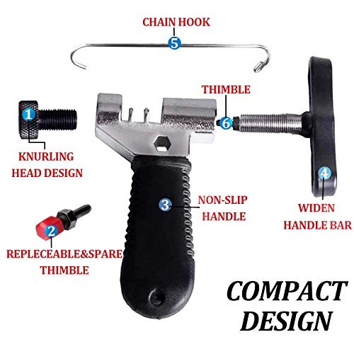- Dispositivo di rimozione della catena professionale: facile da spezzare, facile da ricatenare, la scanalatura unica nella parte superiore rende facile vedere fino a che punto si apre il perno e si rimuove la catena tagliata con il perno dallo strumento.