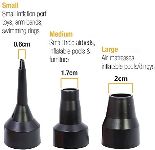- 【VIENE FORNITO CON 3 UGELLI】3 aria ugelli soddisfa le sue molteplici esigenze, può entrare nelle valvole nascoste. L Size per gonfiare materassi, piscina gommone; Taglia M per gonfiare piccolo letto, piscina sedile gonfiabile; Taglia S per gonfiare piccoli giocattoli o anelli di nuoto gonfiabili.