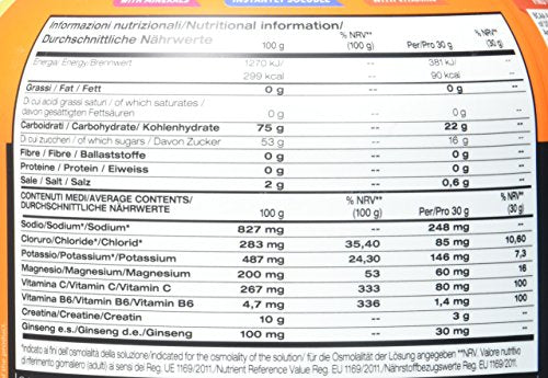 DescrizioneFormulazione Isotonica (314,24 mosm/Kg) a base di Maltodestrine, Minerali e Vitamine, arricchita con Creatina e Ginseng. Magnesio e Potassio contribuiscono alla fisiologica funzionalità muscolare. Il Ginseng vanta proprietà toniche e può risultare utile in caso di stanchezza fisica e mentale. La Creatina (3g/giorno) incrementa le prestazioni fisiche in caso di attività di endurance, di elevata intensità e di breve durata.IngredientiDestrosio, Maltodestrine 21%, Creatina monoidrato, acidificante: acido citrico; aroma: arancia rossa; citrato di sodio, coloranti: curcumina, rosso barbabietola; citrato di potassio, citrato di magnesio, sodio cloruro, Vitamina C (acido-L-ascorbico), agenti antiagglomeranti: biossido di silicio, fosfati di calcio; edulcorante: sucralosio; Ginseng (Panax ginseng C.A. Mey.) radice e.s., Vitamina B6 (piridossina cloridrato).Informazioni legaliIndicazioni:*le soluzioni di carboidrati ed elettroliti (314,24 mOsm/kg di acqua) contribuiscono all'idratazione (aumentano l'assorbimento dell'acqua durante l’esercizio fisico prolungato) e al mantenimento di prestazioni di resistenza. *Il Magnesio contribuisce all’ equilibrio elettrolitico e, insieme alla Vitamina C, contribuisce alla riduzione della stanchezza e dell’affaticamento. Il Ginseng aiuta a contrastare la stanchezza fisica e mentale. La Creatina incrementa le prestazioni fisiche in caso di attività ripetitive, di elevata intensità e di breve durata. L’effetto benefico si ottiene con l’assunzione di 3g di Creatina al giorno. Avvertenze: gli integratori non vanno intesi come sostituti di una dieta variata, equilibrata e di un sano stile di vita. Non superare la dose giornaliera consigliata. Non assumere in gravidanza e nei bambini e non assumere per più di un mese consecutivo. Tenere fuori dalla portata dei bambini al di sotto dei 3 anni d’età. Per la presenza di creatina il prodotto è destinato ai soli adulti. Non utilizzare in gravidanza. Modalità di conservazione: conservare in luogo fresco e asciutto. Il termine minimo di conservazione si riferisce al prodotto correttamente conservato, in confezione integra.Contenuto della confezioneBarattolo da 480g di formulazione idrosalina isotonica.Visualizza di più