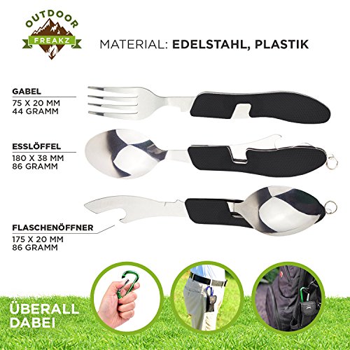 Colore:NeroPosate da viaggio e da campeggio FREAKZ OUTDDOR Viaggiare per il mondo e non avere mai le posate giuste. Con queste posate da viaggio sarai sempre ben preparato: sia che tu sai in campeggio, che tu ti stia arrampicando, che tu stia viaggiando, che tu stia prendendo parte ad un barbecue o che tu sia con lo zaino in spalla, il set di posate giusto per te ti accompagnerà sempre. Minimizzato alla perfezione, contiene solo gli strumenti più importanti: - cucchiaio - coltello - forchetta - apri bottiglia La più alta qualità per le massime esigenze: Il set di posate è fatto di acciaio inossidabile, la custodia delle posate è in neoprene ad alte prestazioni. Con 130 grammi questo kit di posate da viaggio leggero. Grande vantaggio: Se anche le posate si trovano ancora bagnate dall’ultimo lavaggio nel fiume in montagna, possono essere riposte nella custodia in neoprene impermeabile senza problemi. Inoltre ha un moschettone per un facile trasporto incluso. Essenziale Per chi non ama i fronzoli e le posate apribili e chiudibili, troverà in questo set delle posate essenziali, che rispondono appieno alle esigenze di chi viaggia o è in campeggio poiché sono: piccole, leggere e resistenti! Da noi per voi! Questo è un prodotto di "FREAKZ OUTDOOR", fatto per voi, per le persone che amano l’attività all'aria aperta, per migliorare e semplificare la vita all'aria aperta. Tutto quello che dovete fare ora è quello di godervi l'esperienza!