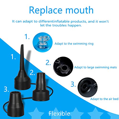 • 【3 Ugelli con Dimensioni Diverse】 - La nostra Pompe elettriche viene fornita con ugelli S-0,6 cm, M-0,8 cm, L-1,8 cm, 3 dimensioni, che soddisfano tutte le nostre esigenze di gonfiaggio o sgonfiaggio di articoli diversi. Come, materassino gonfiabile, materasso ad aria, piscine, zattere, divani ad aria, vasca da bagno, letti ad acqua, barca, giochi da piscina e anelli da nuoto. Nota: si prega di scegliere l'ugello giusto che corrisponde a diversi elementi prima dell'uso.
