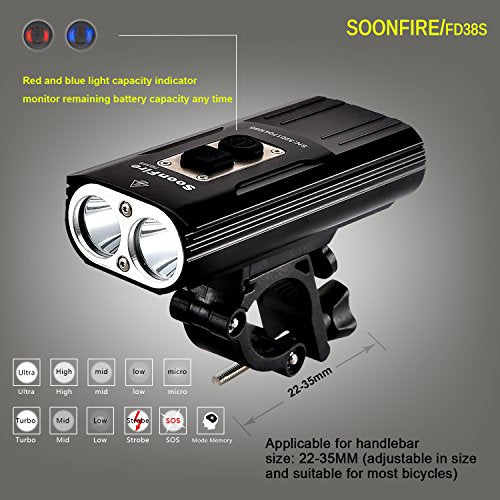 Soonfire FD38S faro per bici’faretto luce per bici ricaricabile via USB Super Luminoso’2 * CREE XM-L2 LED 1870 lumen con una portata effettiva di 167 M’impermeabile’semplice montaggio e smontaggio