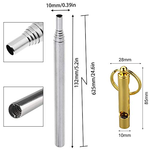 Informazioni sul fischio di emergenza:-Il fischio di emergenza è un aiuto importante per le attività all'aperto e ideale per escursionisti, campeggiatori e donne che viaggiano da soli in situazioni di emergenza.-Il fischio di emergenza è facile da suonare e adatto a persone di tutte le età. Se sei preoccupato per tuo figlio o gli anziani, puoi usare questa pipa come regalo in modo che possano ricevere aiuto dagli altri in caso di emergenza!-Si prega di notare che questo prodotto è un tubo di emergenza e non un giocattolo per bambini di età inferiore ai 6 anni.Informazioni sulla cannuccia per esterni:- Realizzato in acciaio inossidabile, leggero e resistente.- Tubo pieghevole, si estende da 13,2 cm / 5,2 pollici a 62,5 cm / 24,6 pollici.- Inizia a rotolare la legna da ardere con legna umida o asciutta in pochi minuti.- Il design del telescopio consente una stretta interazione con il fuoco senza accovacciarsi o bruciare le braci.- Adatto per la maggior parte delle attività all'aperto come campeggio, picnic e alpinismo.Specifica:Materiale del fischio: lega di zincoMateriale della cannuccia: acciaio inossidabileDimensione del fischio: 85 * 61 * 10mmDimensioni della cannula: larghezza: 10 mm; Lunghezza: da 132 mm / 5,2 pollici a 625 mm / 24,6 polliciColore del fischio: doratoPacchetto compreso:2 * Fischietti di sicurezza per esterni1 * Blow Fire Tube