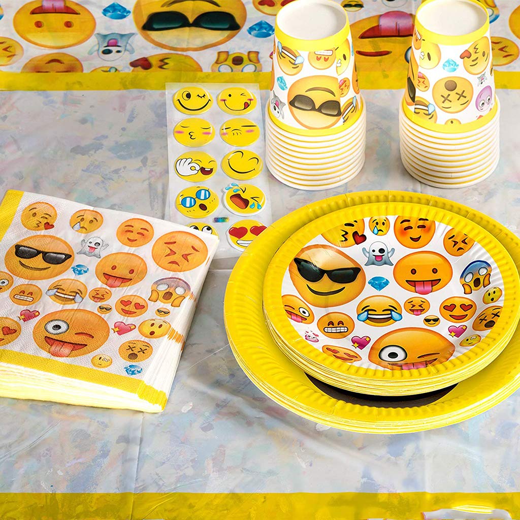 Amycute Set da 94 Pezzi di Emoji Decorazioni, Piatti, tovaglioli, Posate plastica,Bicchieri Carta,Scatole di Popcorn,Bandiera Triangolare,Inserimento Torta Happy Birthday, per 20 Persone