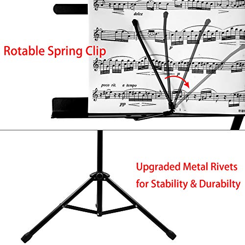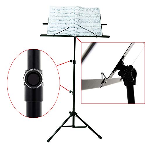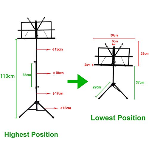 - Affidabile leggio in metallo: I supporti telescopici da Φ19mm/Φ16mm/Φ13mm sono più grandi dei leggii simili presenti sul mercato. Il treppiede in metallo daΦ16mm con gommini anti-scivolo offre stabilità e permette di essere abbassato o sollevato con facilità.