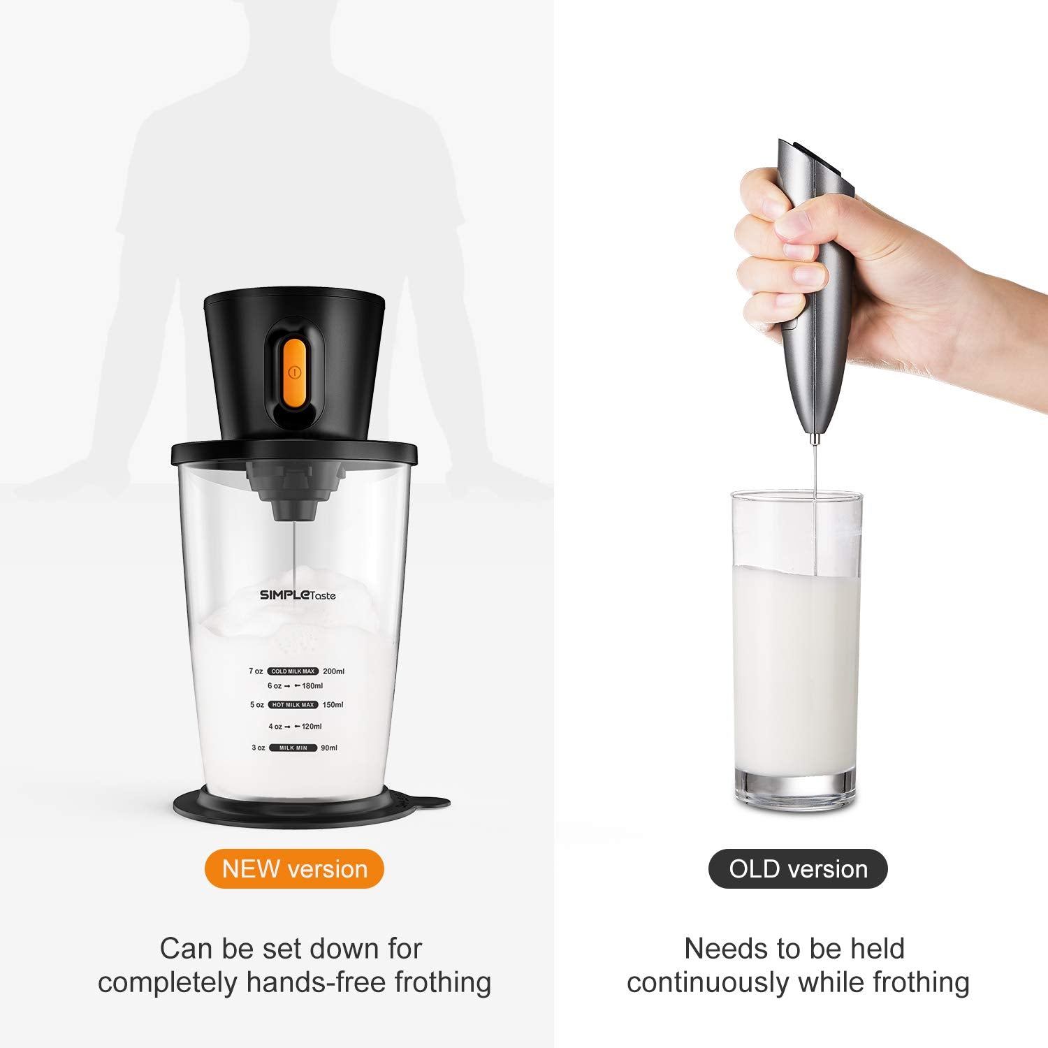 SIMPLETASTE Schiumalatte Elettrico Automatico Professionale, Montalatte a Batteria con Becher per Schiumare Latte Espresso Cappuccino e Caffè, Batterie 2 AA (non incluse)
