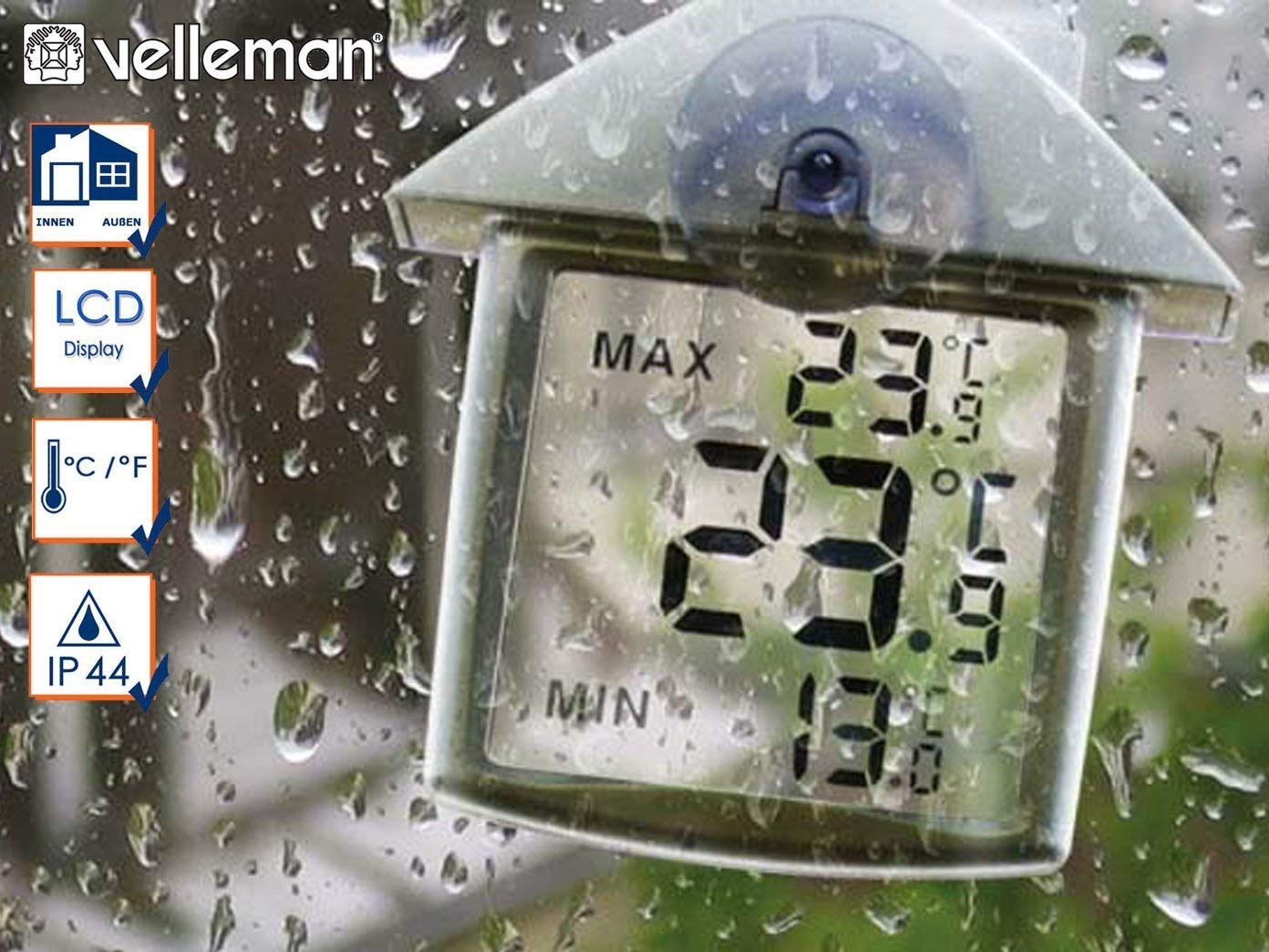 Decorativo e utile allo stesso tempo. Con queste parole si può descrivere il pratico termometro da finestra dalla casa Velleman ideali. Il termometro digitale per interni ed esterni offre un chiaro display LCD ed è ideale come affidabile misuratore di temperatura e il vetro della finestra.