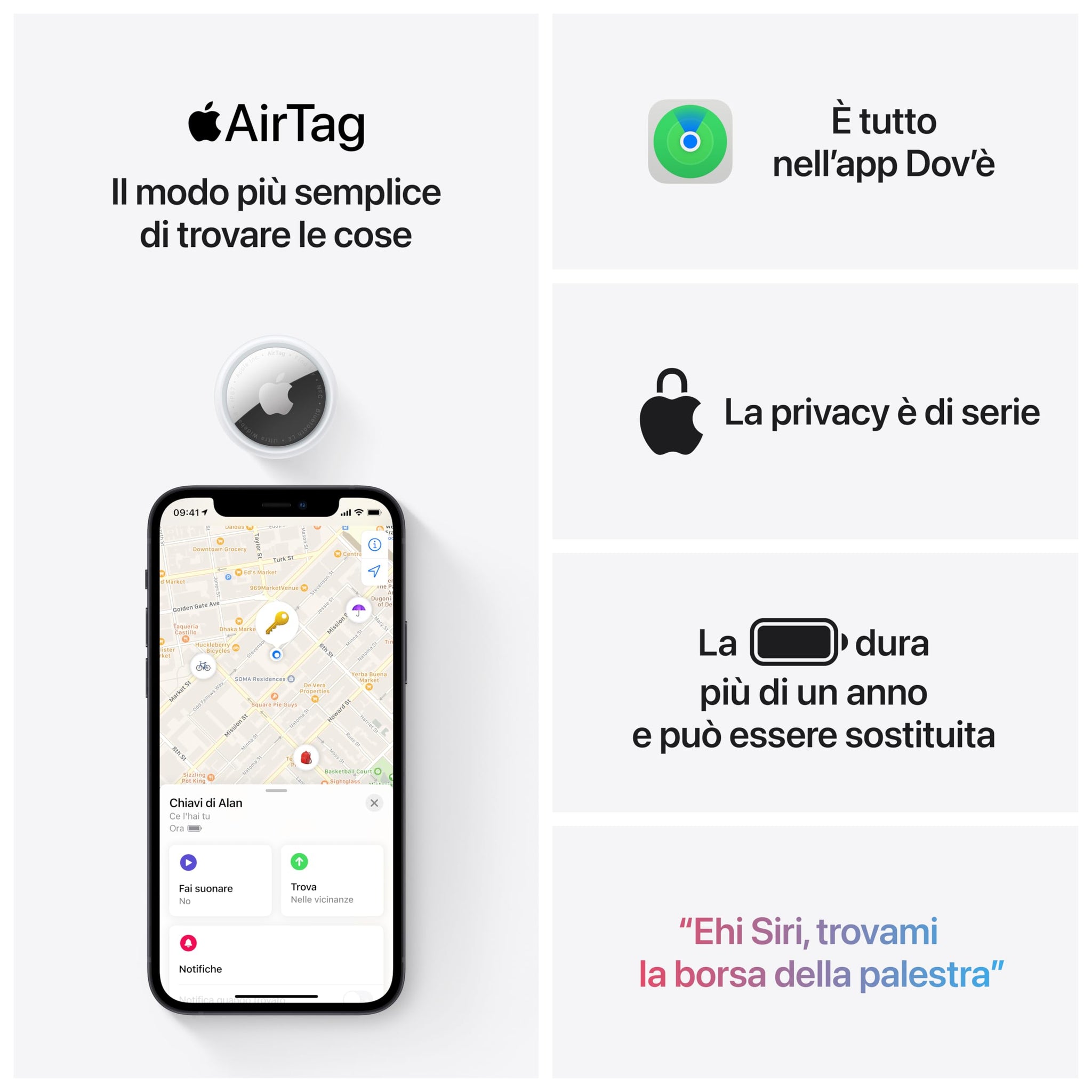 • Per ritrovare un oggetto, puoi far suonare l’altoparlante integrato o chiedere aiuto a Siri