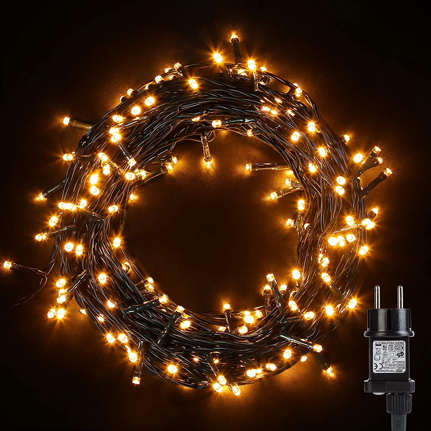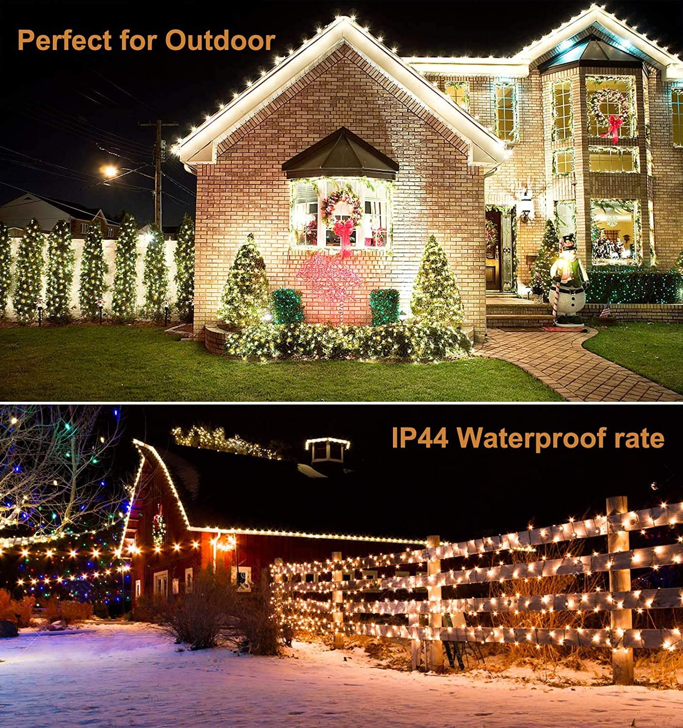 luci Albero di Natale Impermeabili IP44Il cavo e le luci natale esterno a LED sono realizzati in PVC di alta qualità, impermeabile IP44, progettato per resistere a pioggia leggera o schizzi d'acqua. In questo modo, la catena è al sicuro anche nei giorni di pioggia. Lampadine impermeabili (Nota: la spina non è impermeabile) | Specifiche della Luci NataleIl morbido bagliore bianco caldo crea un'atmosfera da sogno, le luci soffuse sono la scelta ideale per decorare finestre, tende, ristoranti, hotel, edifici commerciali, centri commerciali, pub, club, concerti, una sala, un palco da ballo, ecc. Ottime per feste, matrimoni, sfilate di moda, decorazioni per strade, Natale e quasi tutte le altre festività. | 8 Modalità per Abbellire Qualsiasi AmbienteLa luci natale può essere impostata su 8 modalità diverse: combinazione, onde, sequenziale, slo-glo, inseguimento / flash, lento dissolvenza, scintillio / flash, costante. |