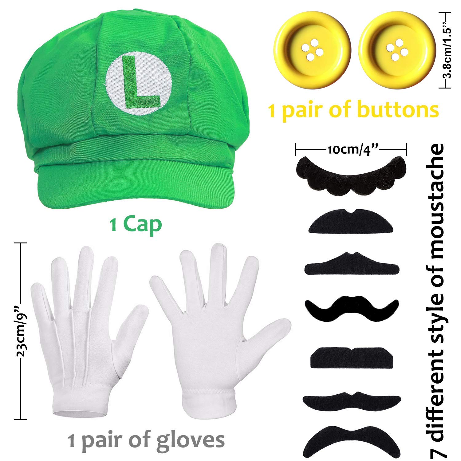 - ♥ 1x cappello Luigi verde, 1 paia di guanti, 2 bottoni gialli, 7 baffi appiccicosi. Indossali e sarai Mario e Luigi !!