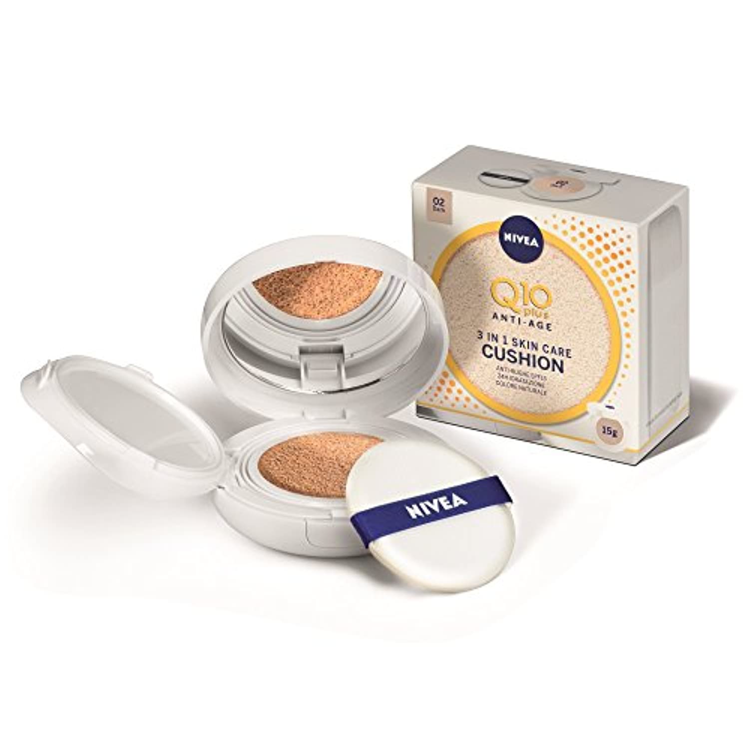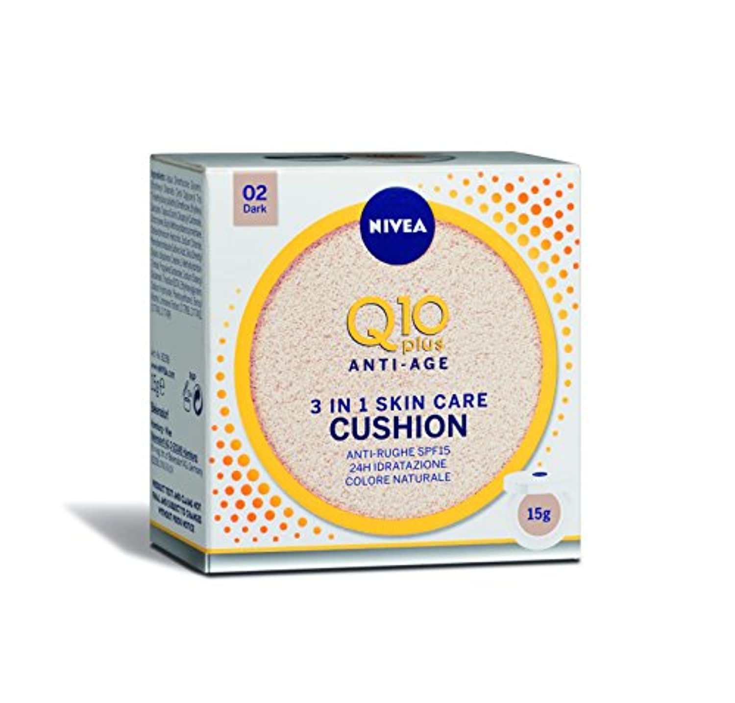 NIVEA Q10 Plus Anti-Age 3in1 Skin Care Cushion, 1 x 15 ml, Crema Colorata Antietà Donna con Fattore di Protezione Solare 15, Crema Idratante e Colorata, 02 Dark