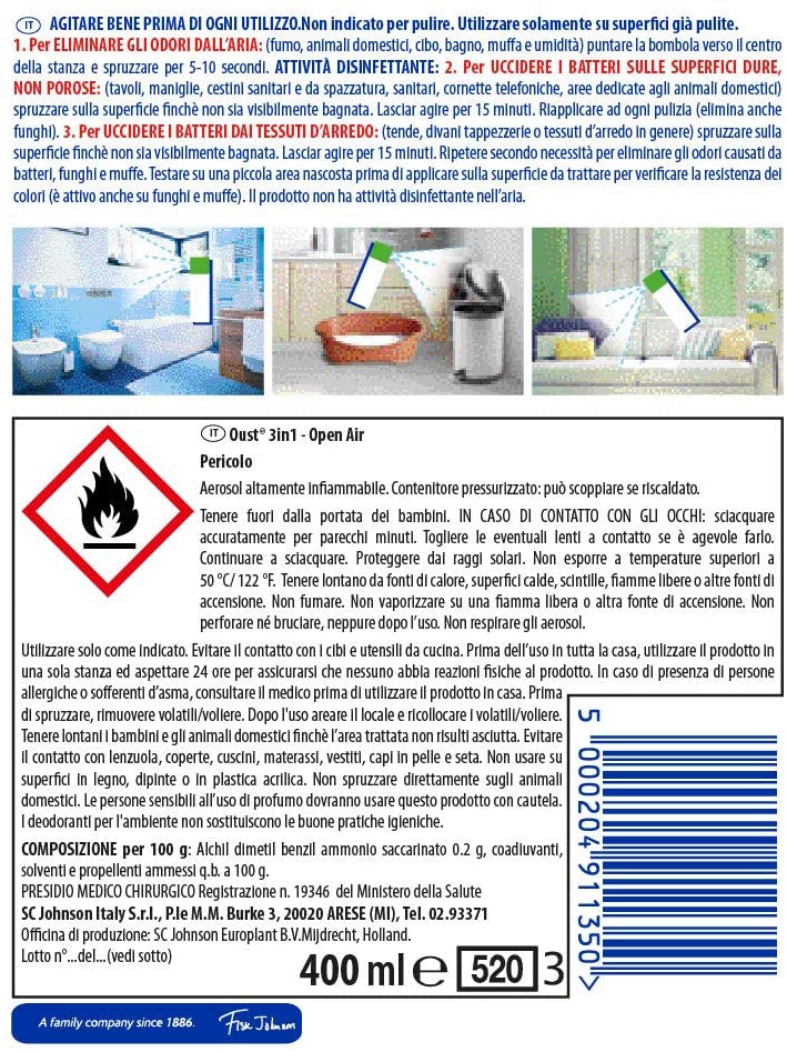 Oust 3 in 1 Spray Disinfettante 400 ml, per Superfici e Tessuti, Uccide il 99,9% dei Batteri ed Elimina gli Odori