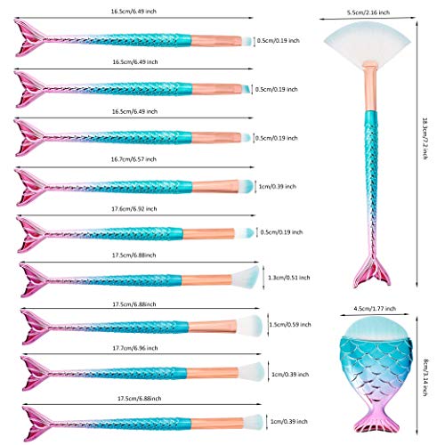 Set di Pennelli Trucco Professionale Spazzole per Bellezza a Forma di Sirena Multicolore Cosmetiche Pennello per Fondotinta, Crema in Polvere, Fard, Ombretto, Sopracciglio, 11 Pezzi